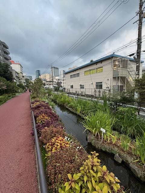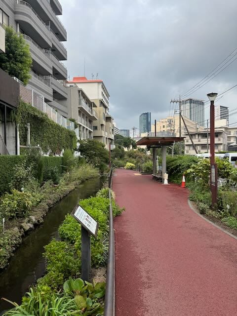 From my home, I run along the Karasuyamagawa Greenway towards the Meguro River (Japanese: 目黒川).