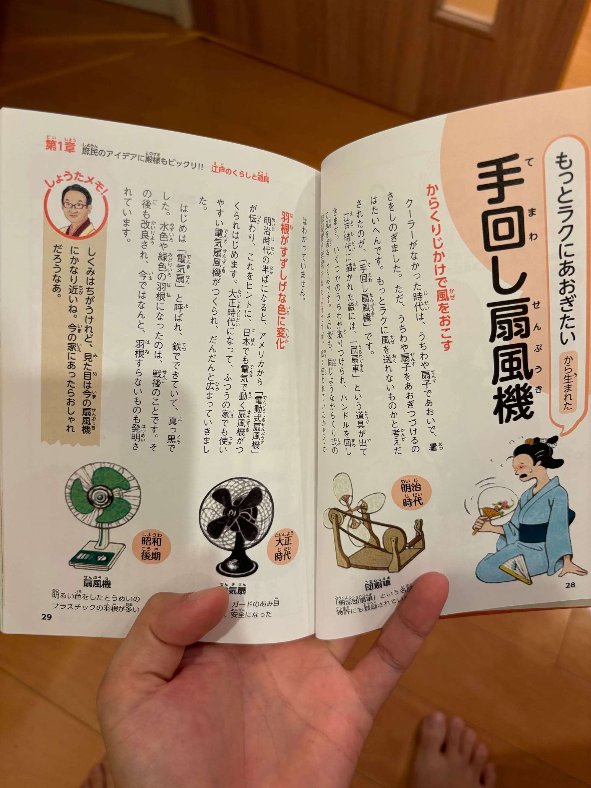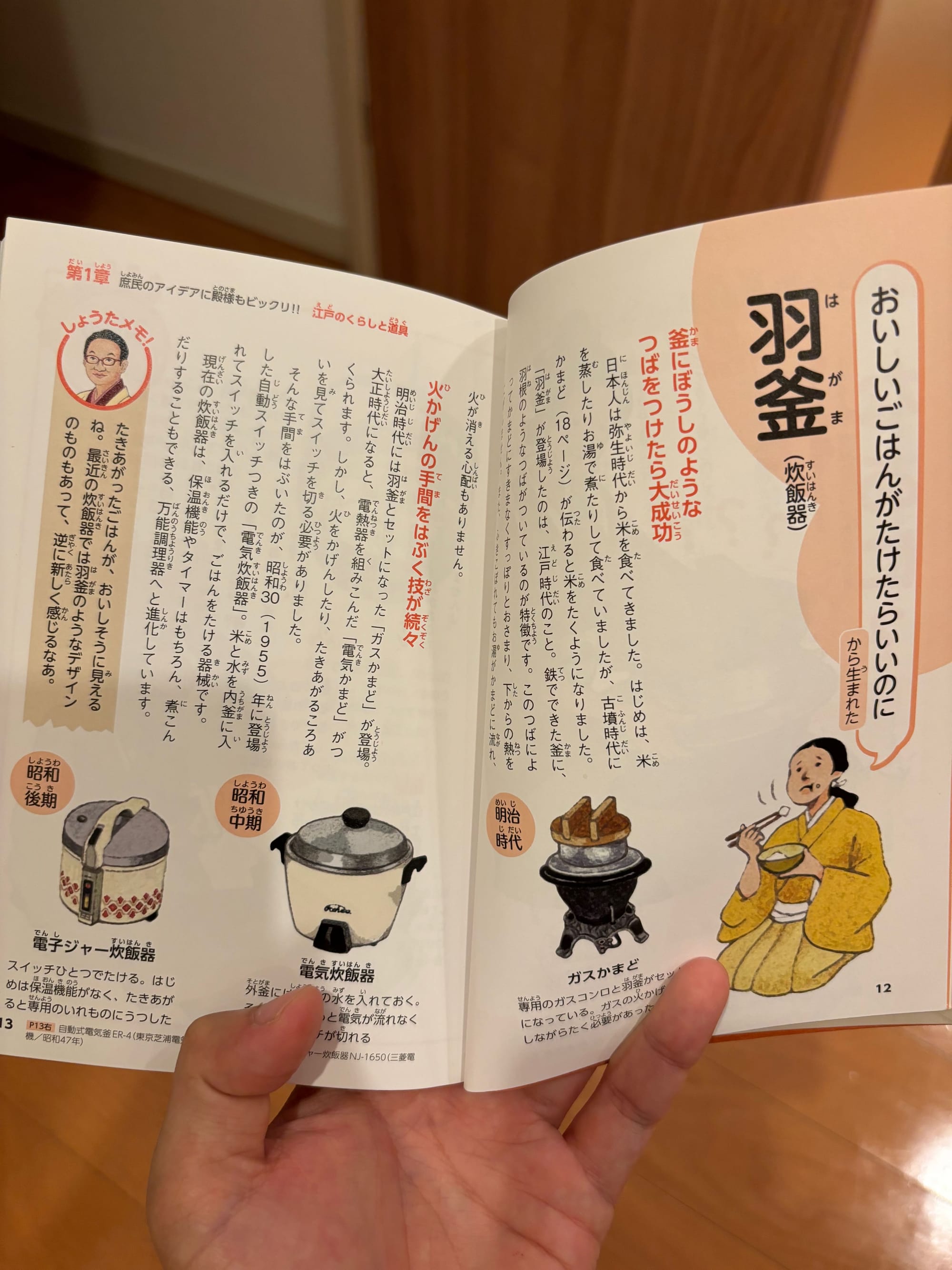 As the title suggests, the author gives readers insights into life in olden day Japan and recounts the technological advancements in everyday tools such as rice cookers, lamps and cooking stoves.
