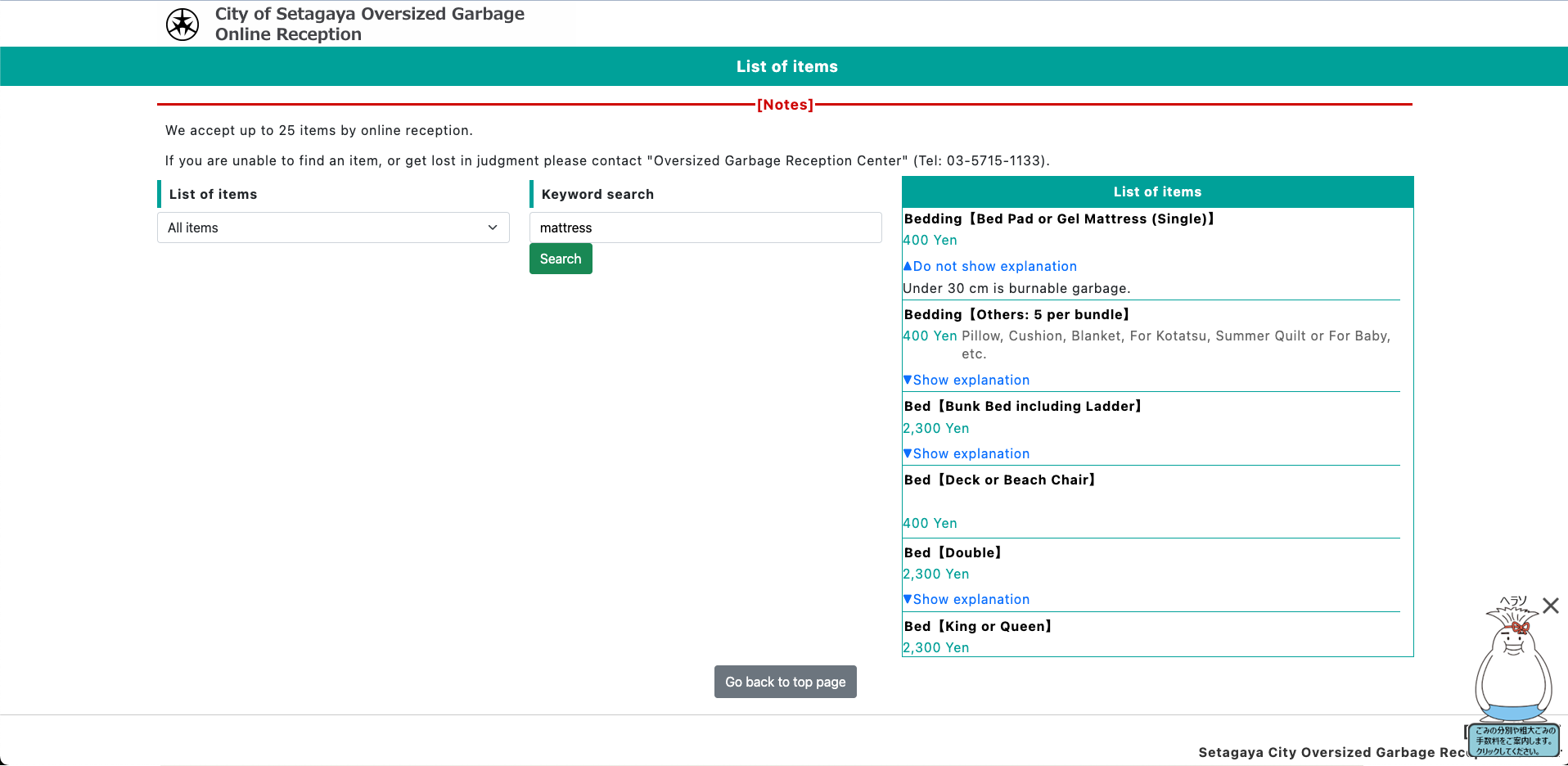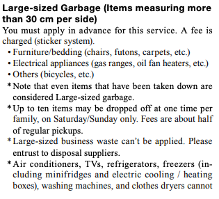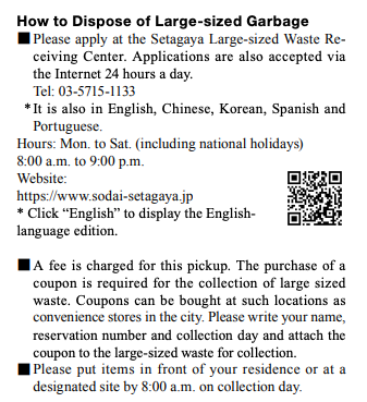 Nothing in life is free, and a fee is needed to cover the labour costs associated with disposal. The disposal price varies by the type rubbish, and information is easily found on Setagaya (Japanese: 世田谷) District's portal.