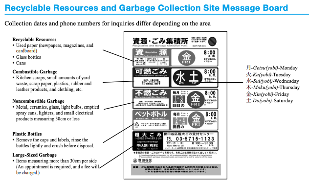 A rubbish collection schedule like the one below is commonly found on community and apartment notice boards. It is also in the "Life in Setagaya" guidebook I received when I became a resident.