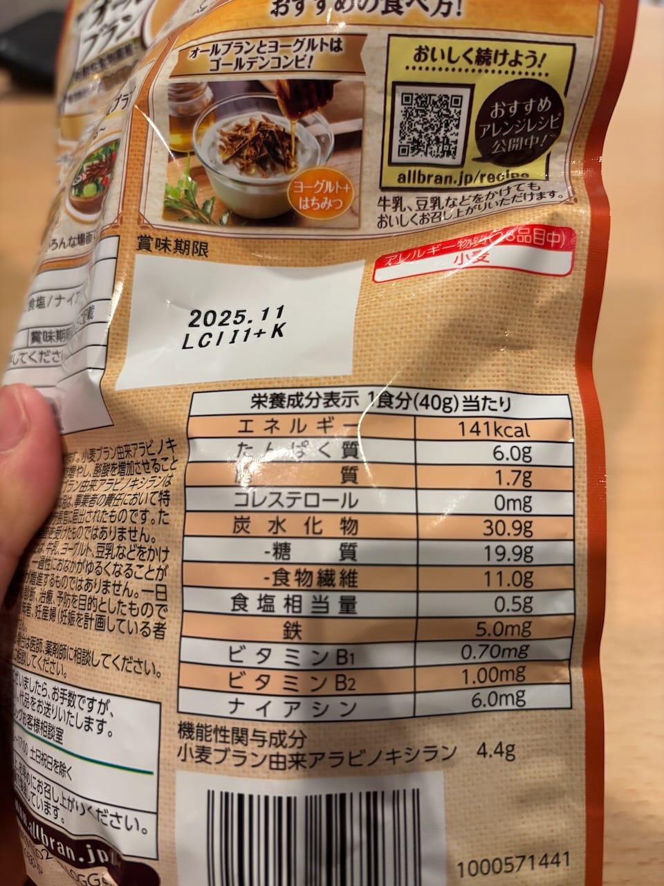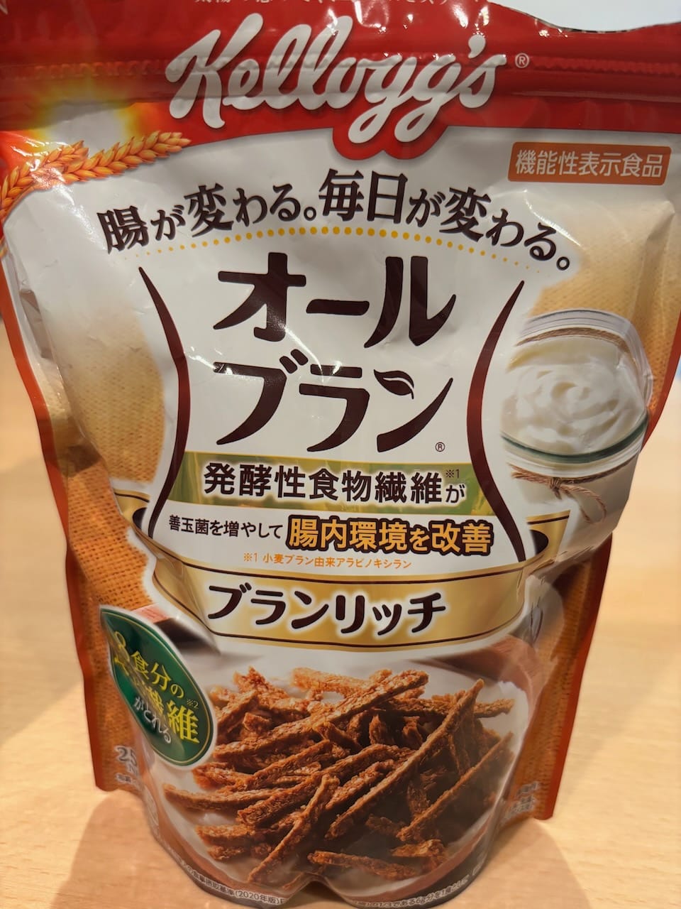 For example, 30 grams of Kellogg's オートミール (English: Oatmeal) has 3 grams of dietary fiber, while 40 grams of Kellogg's ホールブラン (English: All Bran) has 11 grams of dietary fiber ("Dietary fiber" is 食物繊維 ("shokumotsueni") in Japanese).