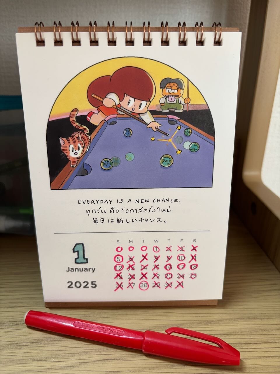 The first is keeping a record using a table calendar and red marker (over a digital approach). Drinking days are marked with a circle, while non-drinking days are marked with a cross. In hindsight, it should be the other way around, but it's a little late for that.