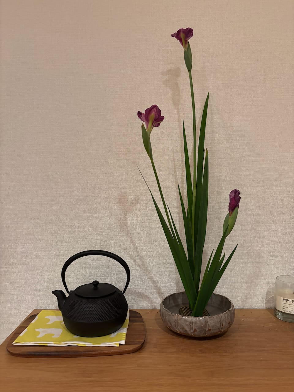 (L) Residual water (dark area inside the tetsubin) gradually self-evaporates (R) Tetsubin next to an Iris ikebana arrangement