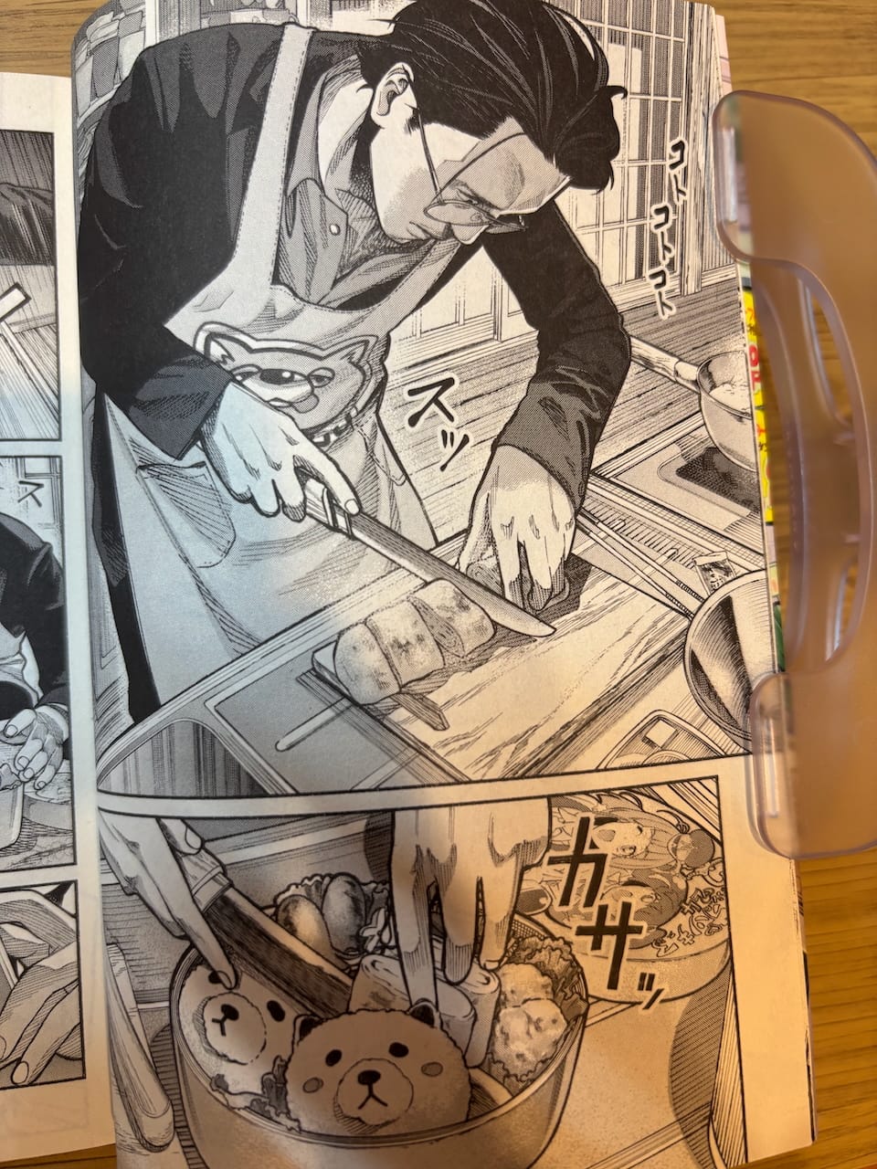 In Volume 1 of the Japanese manga (Japanese: 漫画, English: comic) Gokushufudou (Japanese: 極主夫道, English: The Way of the Househusband), the main protagonist Tatsu (Japanese: 龍, English: dragon) is seen making a tamagoyaki (Japanese: 卵焼き, English: fried egg roll) for his wife's bento set.