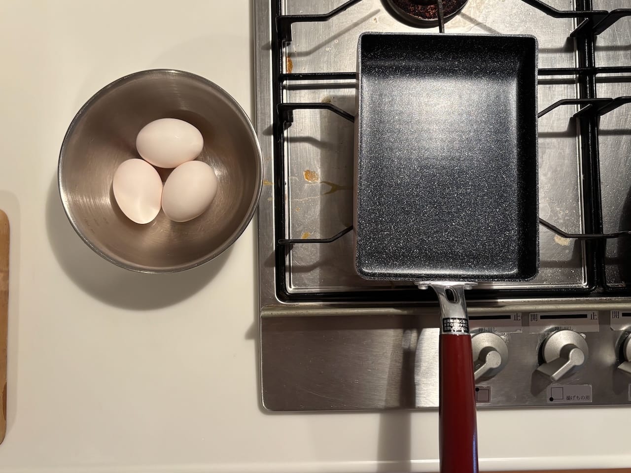 I first bought a simple non-stick, rectangular tamagoyaki frying pan. You can also use a regular cast iron version, but this requires more skill (and oil). You can technically use a round pan, but you're unlikely to get the desired outcome.