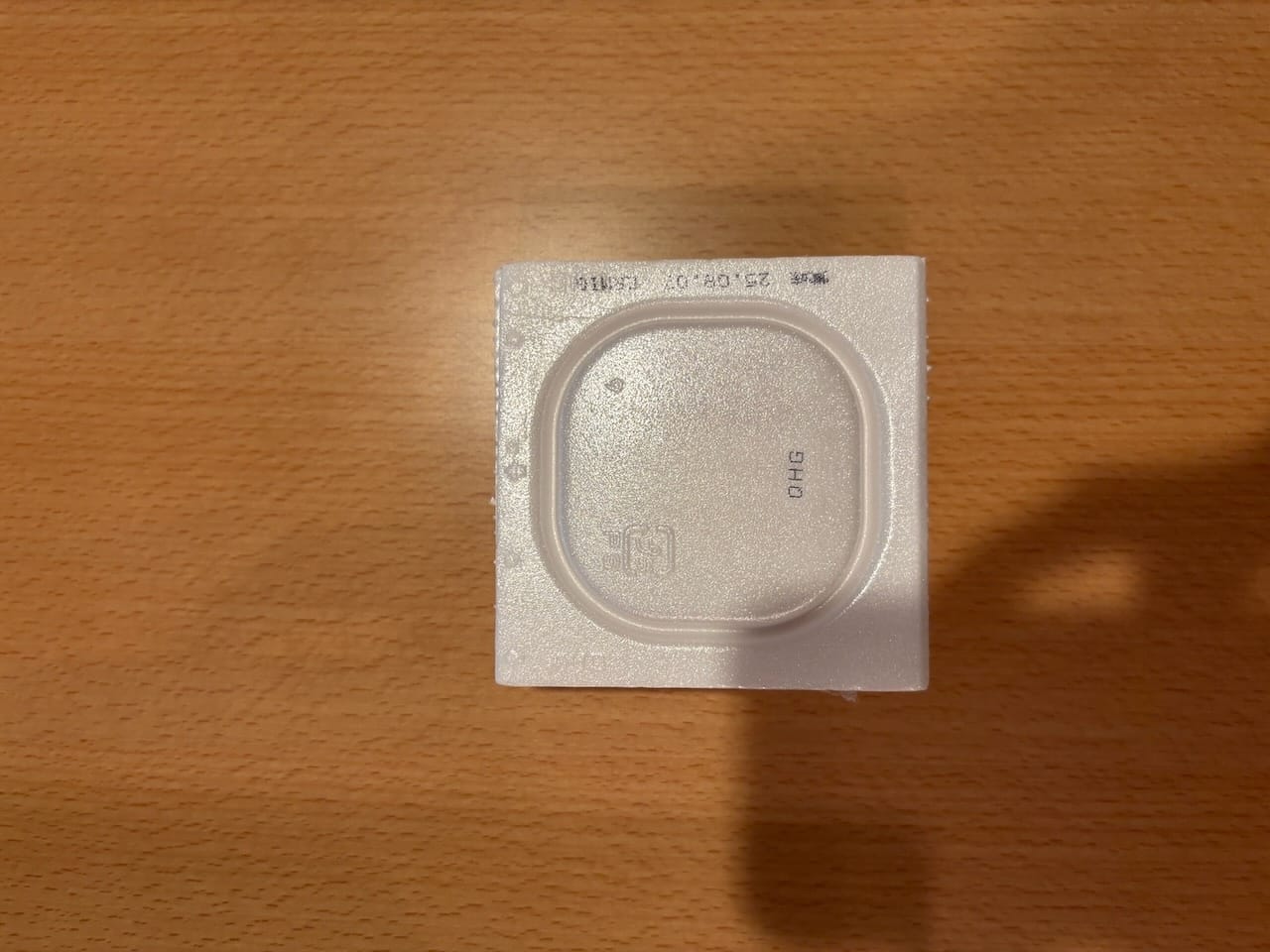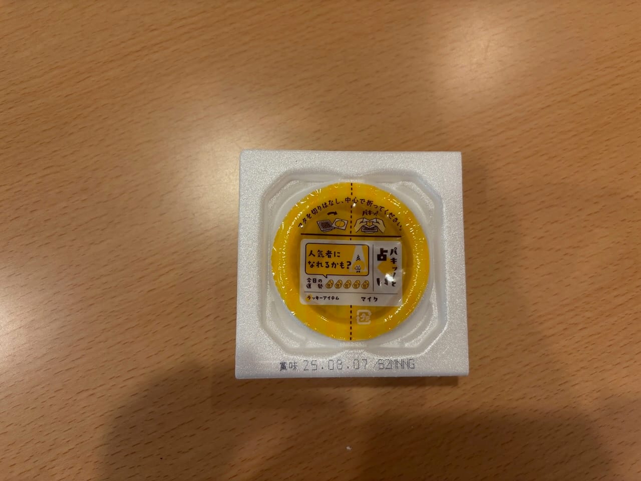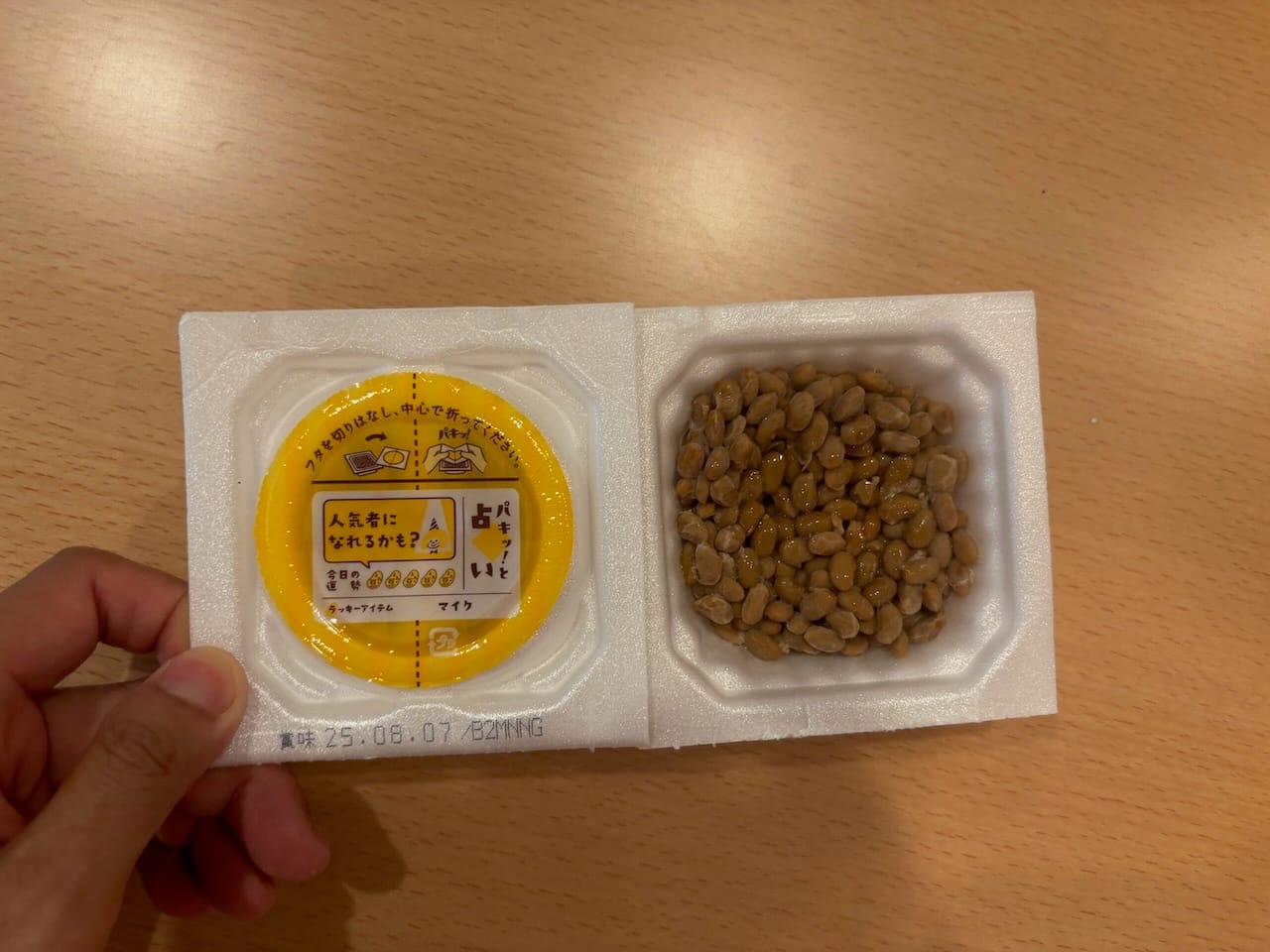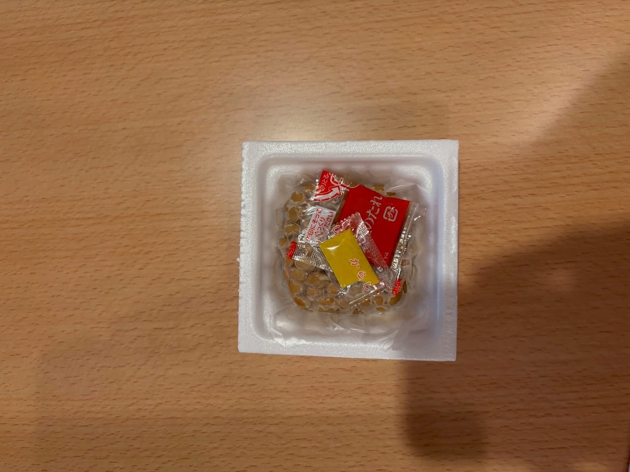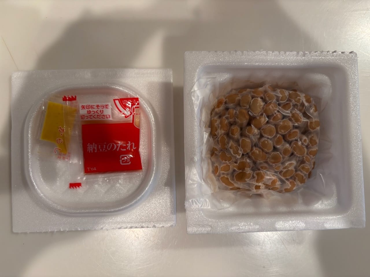 A typical natto package. There is a thin plastic sheet separating the condiments from the natto