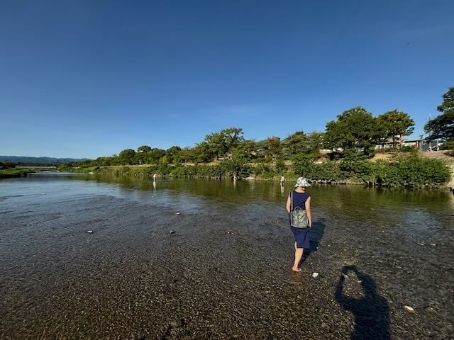 On top of a nice afternoon cycling, we cooled off by walking into the Kamo River. This is safe as the river is quite shallow (less than knee height) with the current being quite weak. Furthermore, as the water originates from the nearby mountains, it is crystal clear and cool.