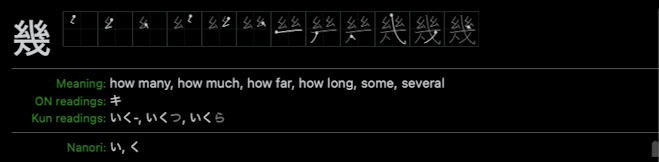 I then learned that 幾 is part of the commonly-used Japanese word ikura (Japanese: 幾ら), meaning "how many" or "how much".